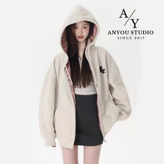 ANYOU 여성 후리스 울라이크 맨투맨 여자 루즈핏 후드 자수 후리스자켓
