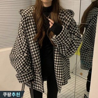 150kg까지 날씬해보이는 여성 트위드 후드 하운드투스 집업 자켓 가을 겨울 빅사이즈 오버핏 체크 큰옷 여성의류 아우터 바람막이 외출 방한 따뜻한 코트 심플 대박난 여자 잠바