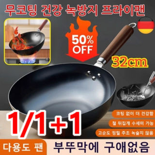 1/1+1 코팅 없는 눌어붙지 않는 무연 프라이팬 독일질화후라이팬 32cm 녹방지 후라이팬, 칼라박스*1+스틸 뚜껑&칼라박스*1, 1개
