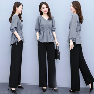 ANYOU 브이넥 루즈 블라우스 와이드 밴딩팬츠 정장투피스 세트