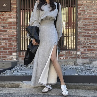 떳다그녀 메이션 맨투맨 치마 투피스 오프숄더 스웨트셔츠 트임 딥슬릿 플레어 롱스커트 세트