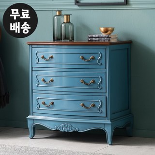 쥬디 엔틱 원목 3단 서랍장 삼단 수납장 수입 안방 거실 낮은 체스트(800블루), 블루